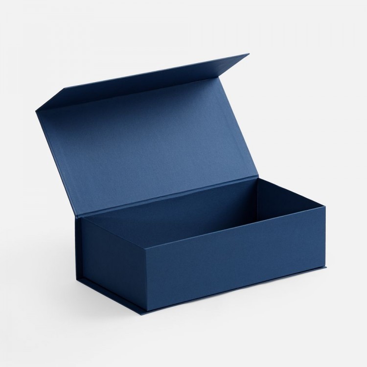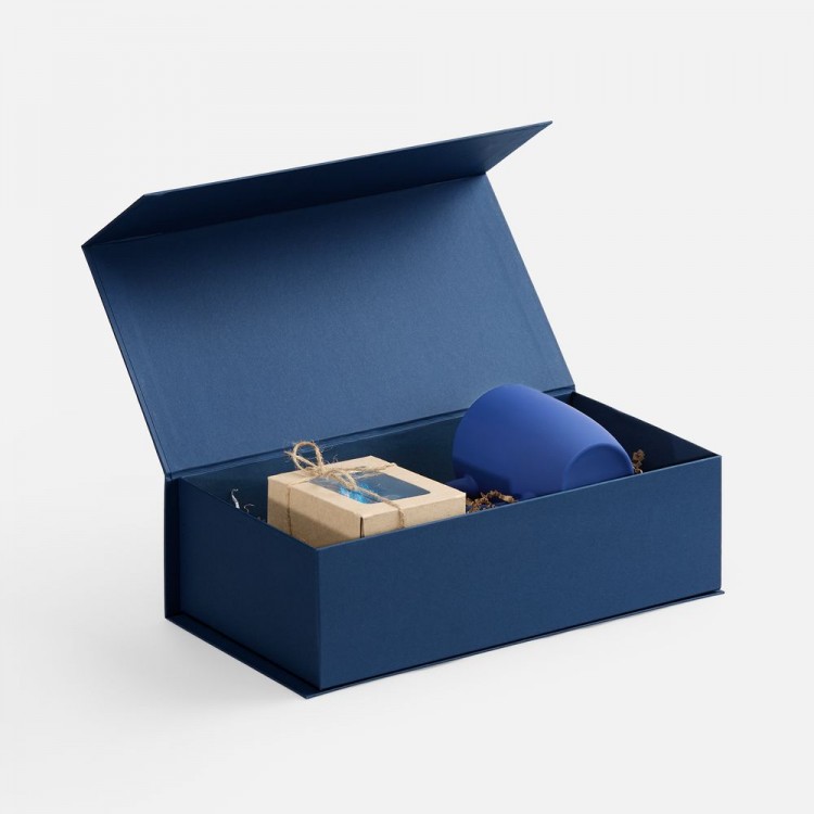 Коробка изготовлена из переплетного картона, кашированного гладкой дизайнерской бумагой Malmero «Благородный синий», с крышкой на магните.