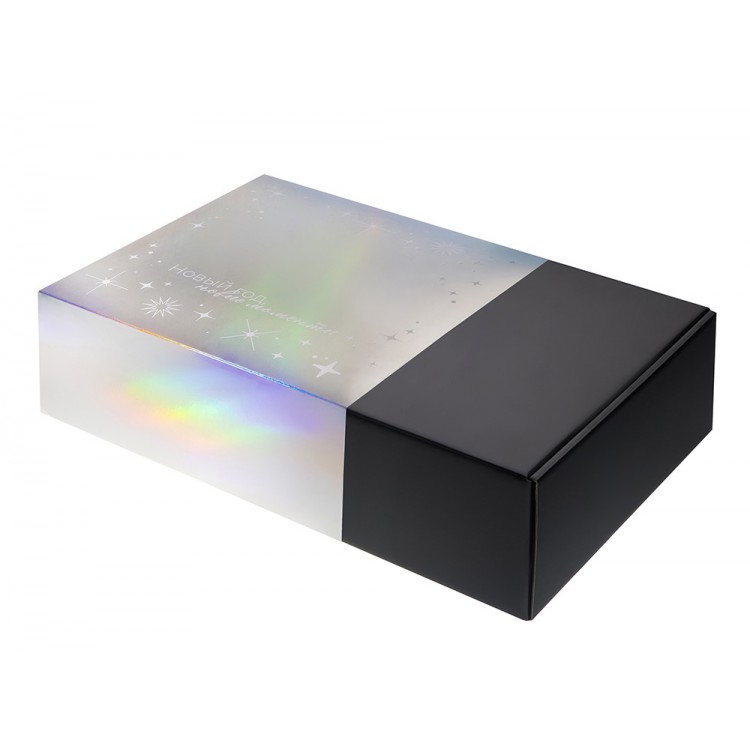 Подарочная коробка из прочного микрогофрокартона, кашированная бумагой с матовой ламинацией, выглядит элегантно и надёжно защищает содержимое. Новогодний голографический шубер с мерцающими серебристыми переливами придаёт ей праздничный блеск и делает каждый подарок по-настоящему особенным.
