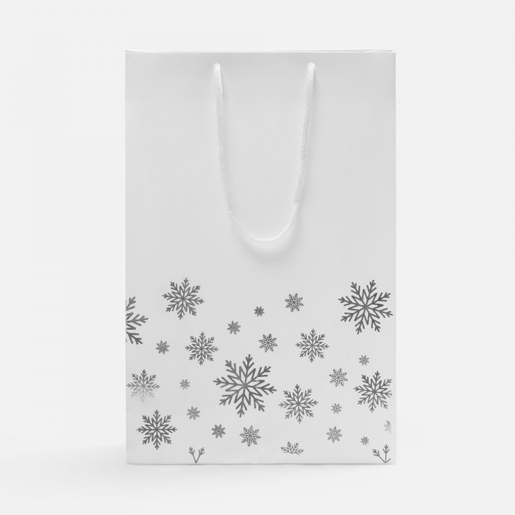 Пакет из бумаги плотностью 120 г/м²с покрытием софт-тач и тиснением серебристой фольгой.Выдерживает вес до 2 кг.