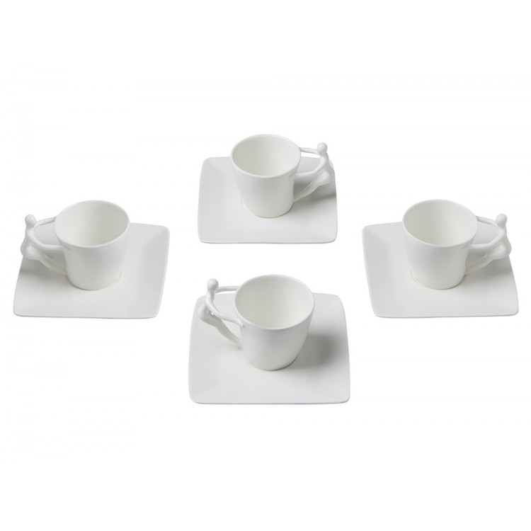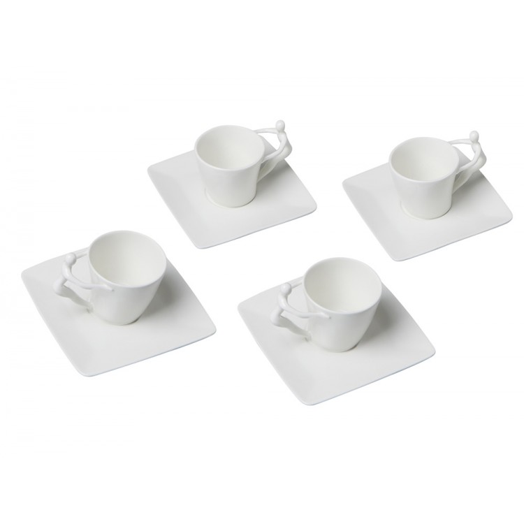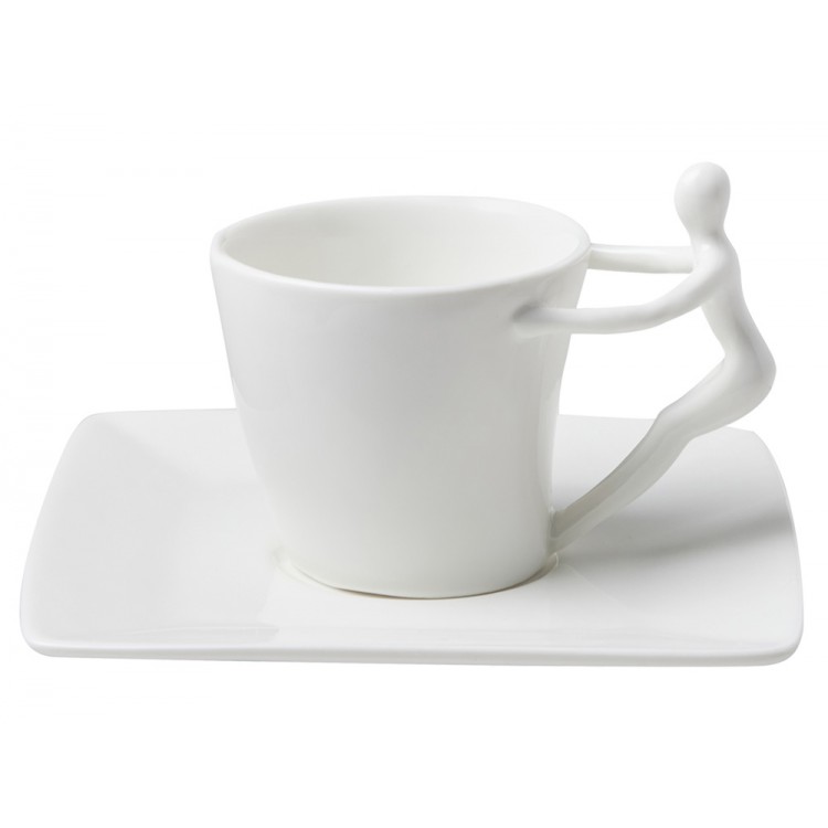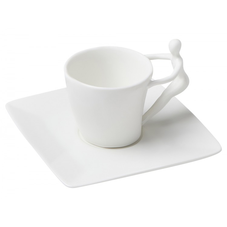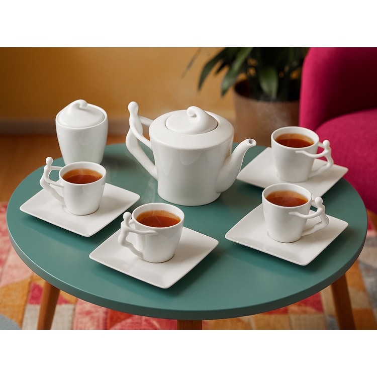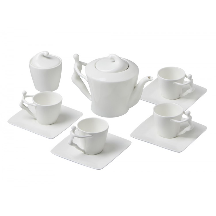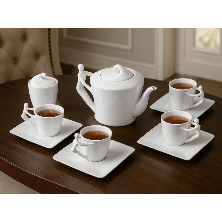Ручки чашек и чайника выполнены в виде стилизованной фигуры человека. Это придает сервизу особый характер и глубину, превращая процесс чаепития в диалог с искусством.