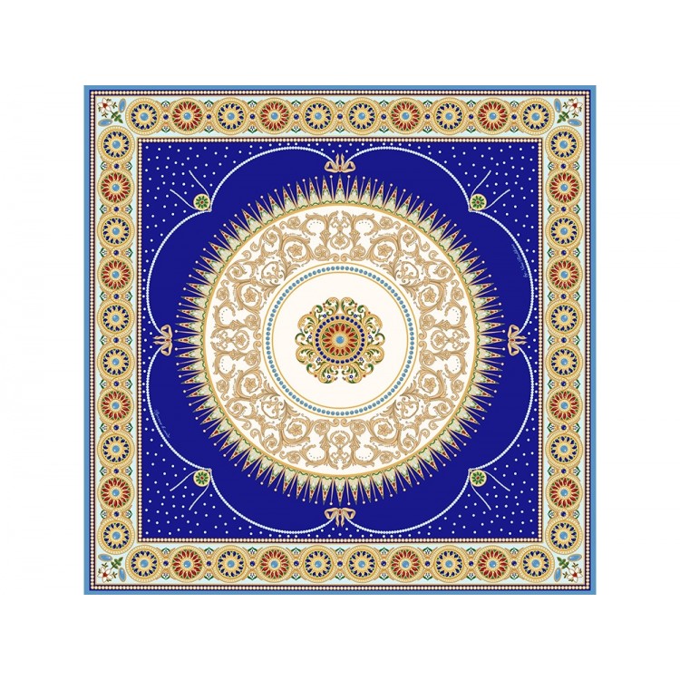 В центре полотна размещен изящный медальон, повторяющий оригинальный рисунок севрского фарфора, выполненного в ювелирной технике накладных эмалей и словно украшенного россыпью драгоценных камней. Цветовой строй воспроизводит парадную эстетику дворцового фарфора, где глубокий королевский синий в сочетании с золочёным орнаментом образуют гармоничное звучание.
