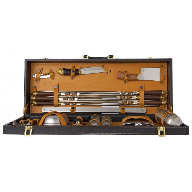 Все аксессуары упакованы в кейс из сплит-кожи, внутренняя отделка натуральная кожа с художественным выжиганием. Каждое изделие уникально, так как художественное выжигание может отличаться от представленного на фото, что придаёт набору особую индивидуальность. Все аксессуары надежно крепятся к кейсу кожаными ремешками на кнопке, обеспечивая удобство транспортировки и сохранность содержимого.