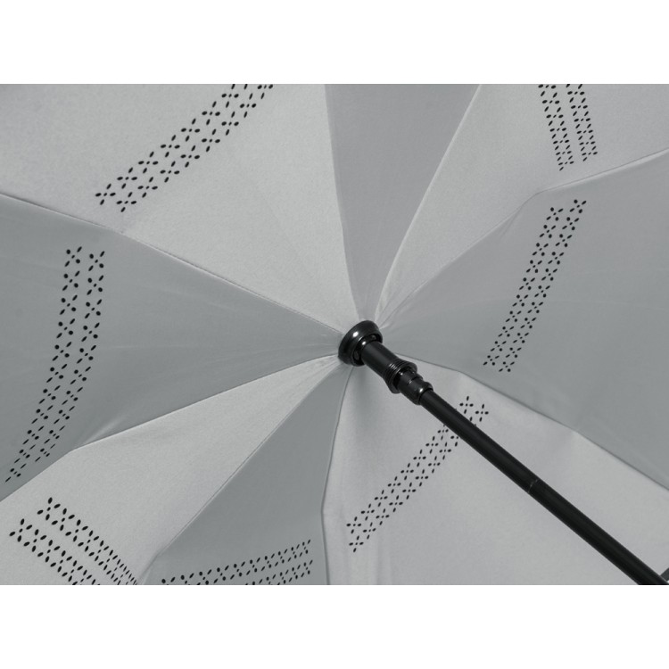 Зонт с обратным сложением складывается внутрь. Очень удобен в использовании, например, во время посадки в машину при складывании вода остается внутри купола. Для просушки зонт можно поставить вертикально на пол в сложенном виде, что позволяет воде стекать без раскрытия зонта. Двойной купол из 190Т эпонжа. Ручка с мягким покрытием soft-touch для большего комфорта.